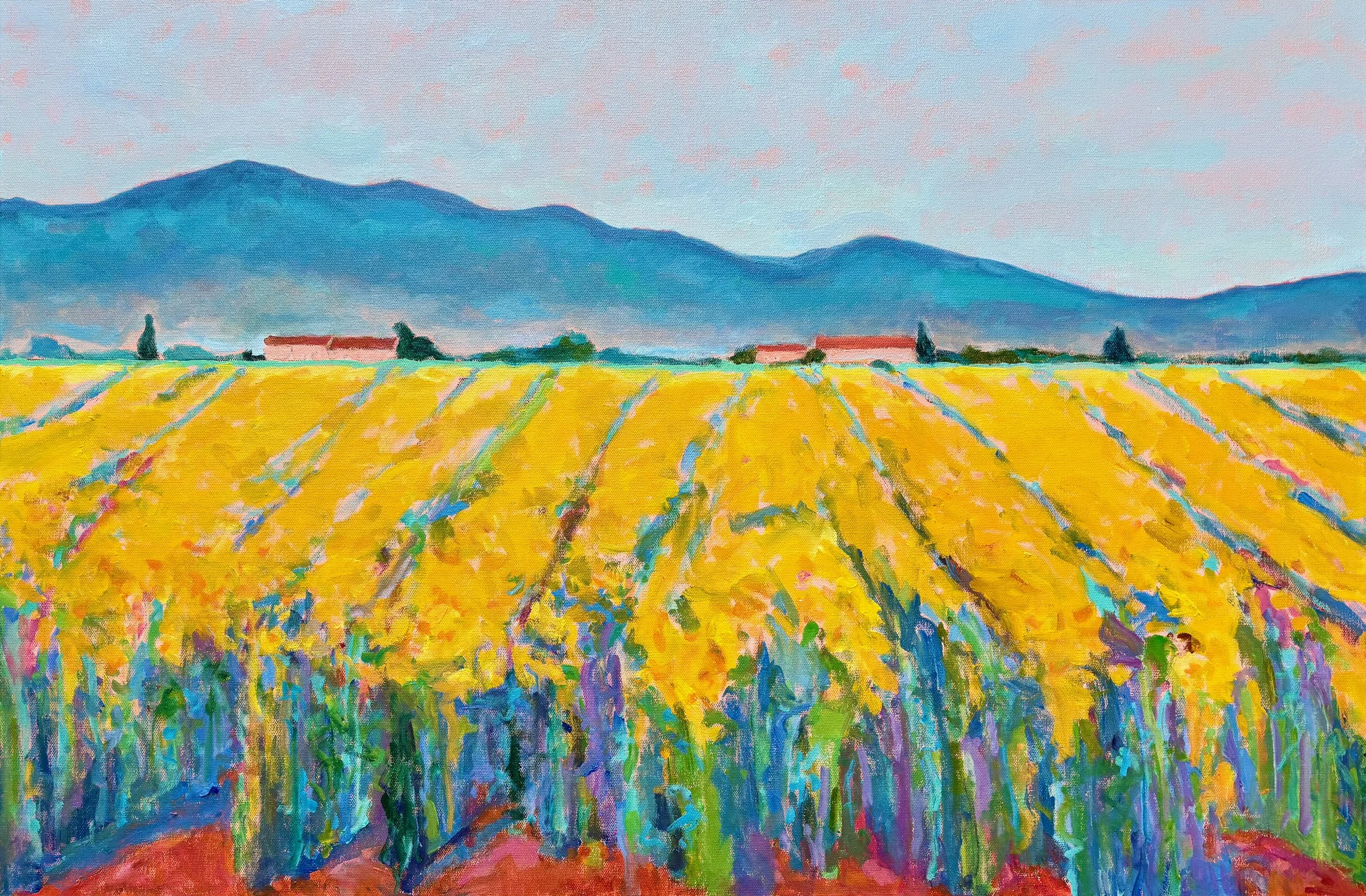 Tom takes the viewer along as she travels the back roads of Italy, a field of lavender in Provence, an umbrella-strewn beach in East Hampton. Landscapes and structures are predominant in her paintings with figures rarely seen, but implied. The viewer is invited to enter the painting – an empty chair is left to fill, a worn footpath leads to an old villa perched above a grove of olive trees where one can sit and drink a glass of wine. Through her deft use of color and light, Tom invites us to celebrate the world.